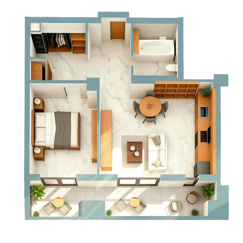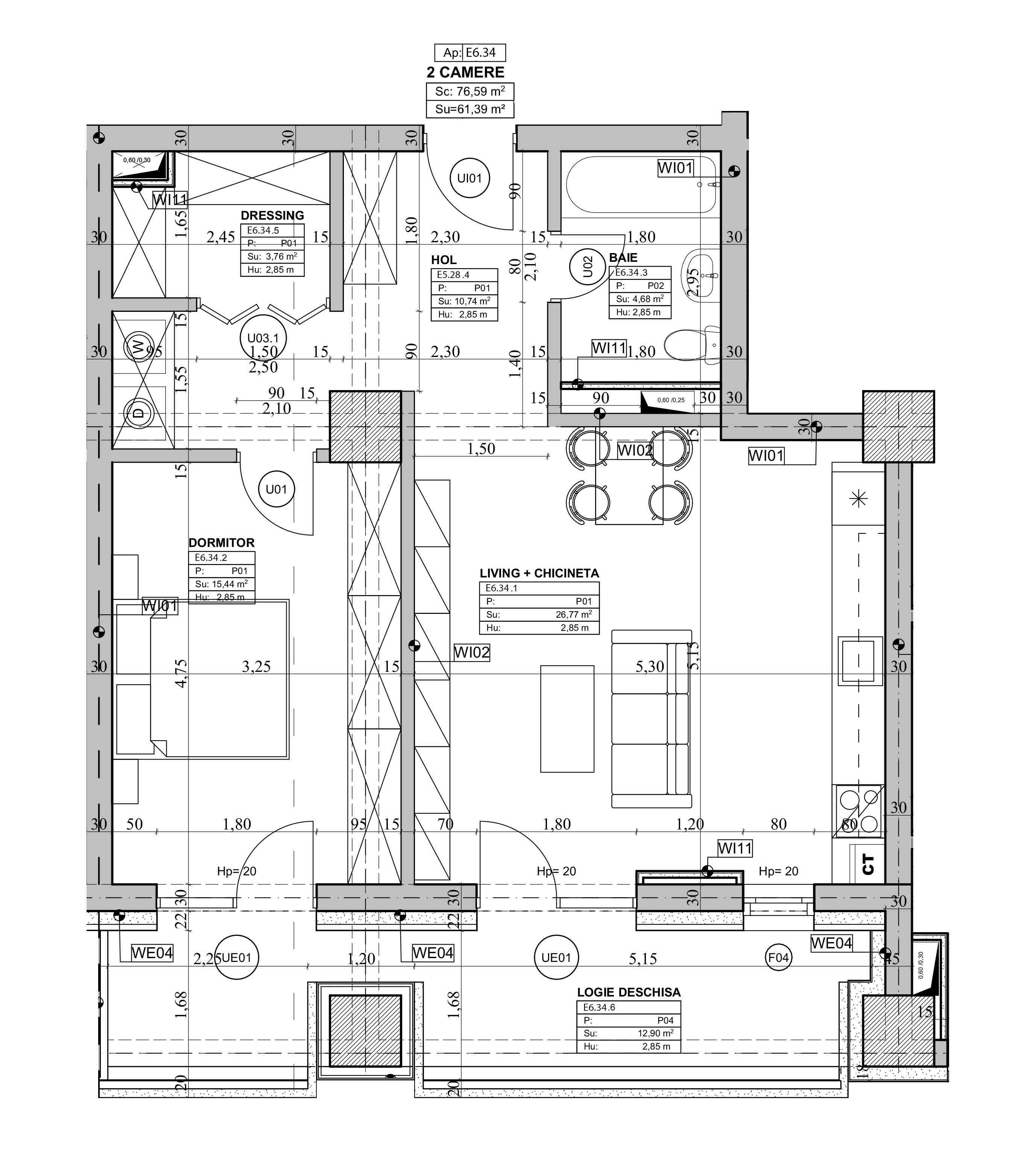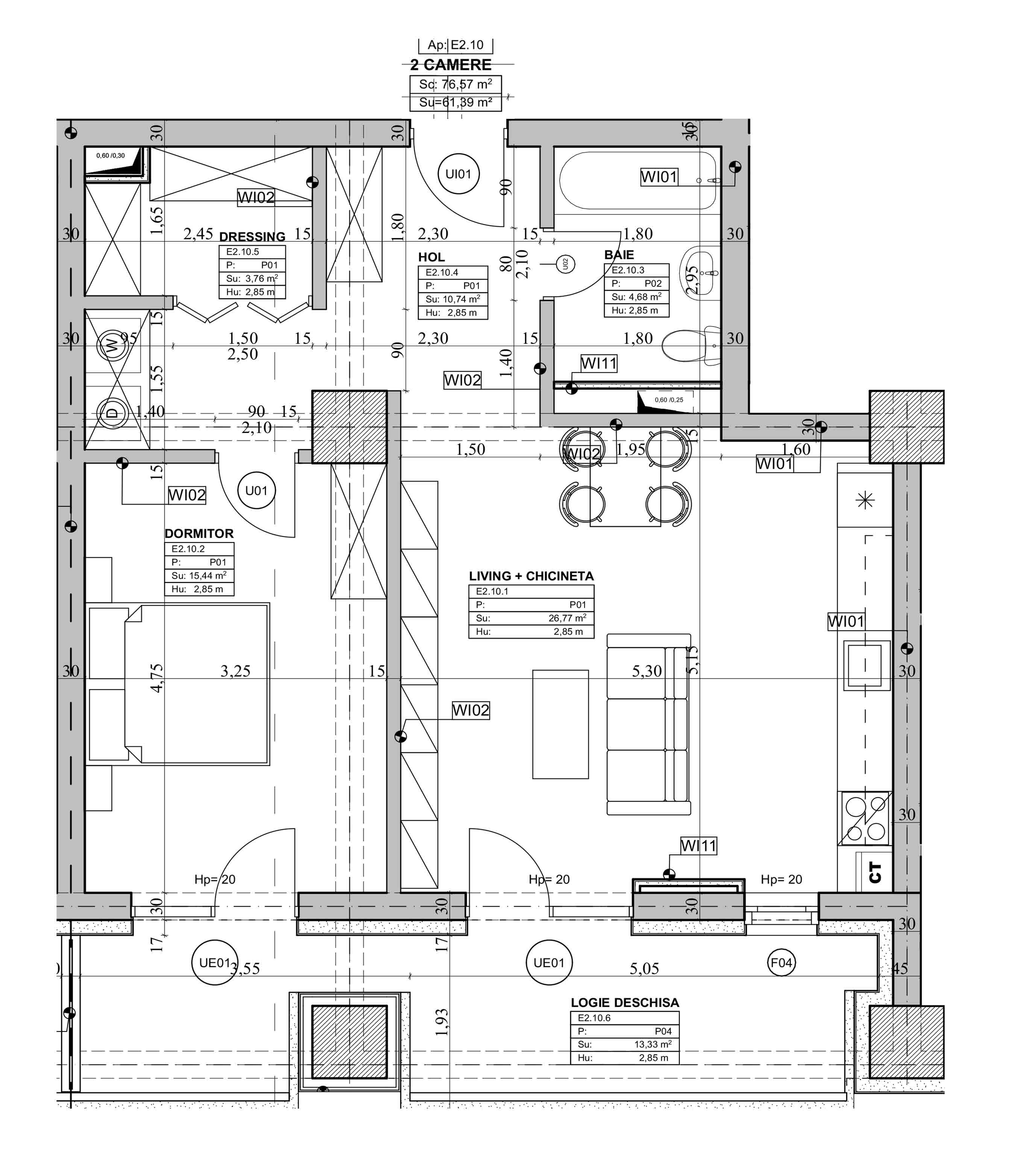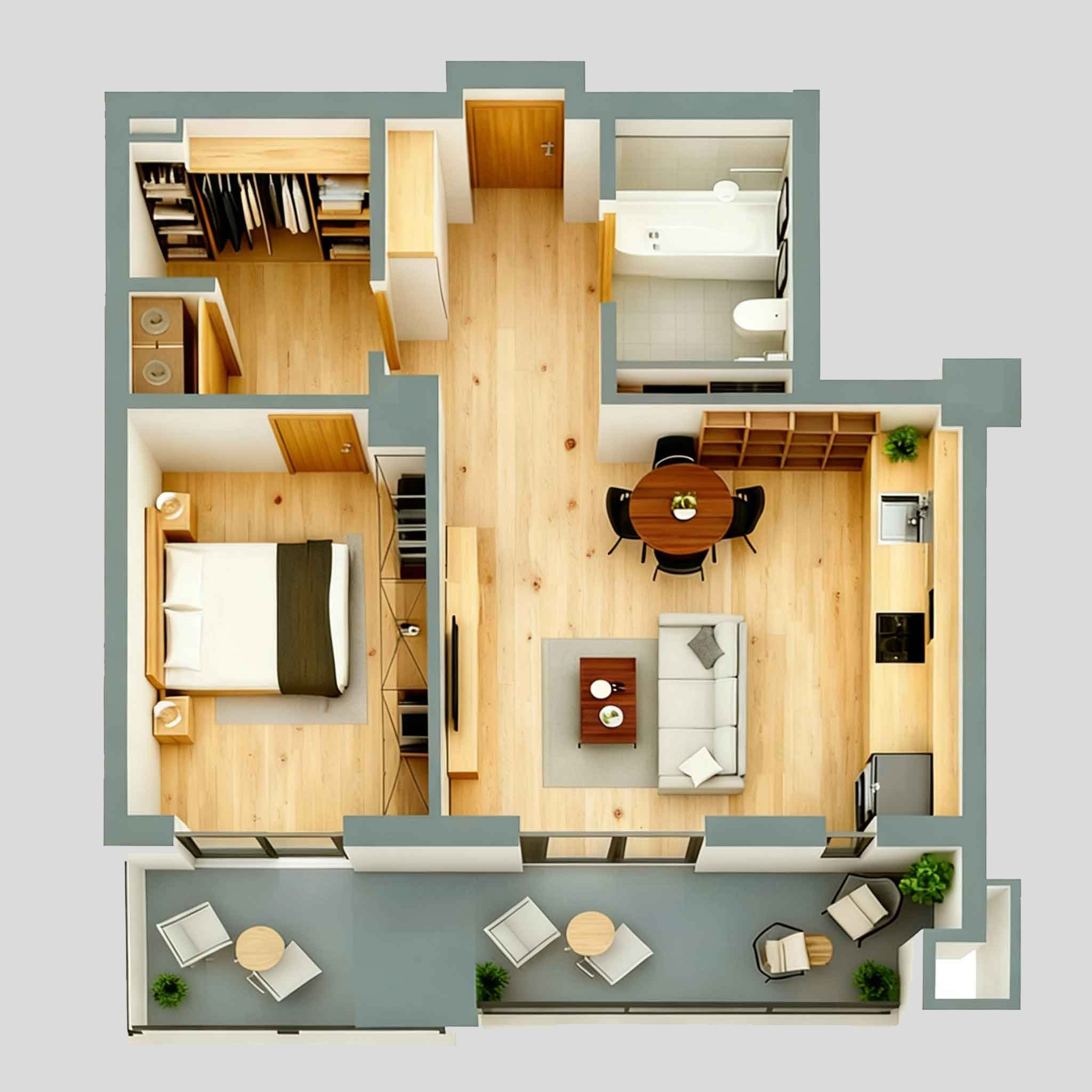 Acest apartament cu 2 camere oferă o compartimentare eficientă și un design contemporan. Livingul cu bucătărie open-space este luminos și primitor, iar dormitorul separat asigură intimitate și confort, fiind completat de un dressing generos. Baia este modern amenajată, iar terasa spațioasă, accesibilă atât din living, cât și din dormitor, adaugă un plus de relaxare și funcționalitate.